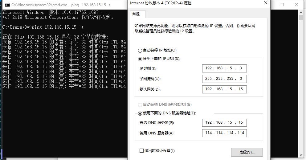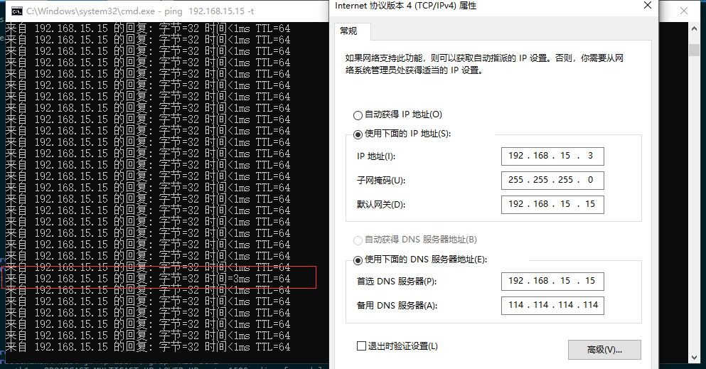 此时192.168.15.15/24已经回到了主机的端口上,至此两机vrrp建立成功,也成功实现双机热备,剩下的只需要去DHCP上将分配的默认网关和DNS修改为192.168.15.15即可