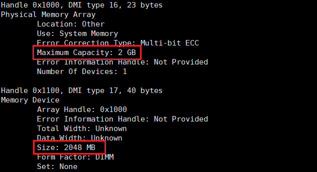 使用命令 dmidecode 查看底层硬件信息,可以看到我的 2G 内存的服务器是分配足了 2048M 内存的。