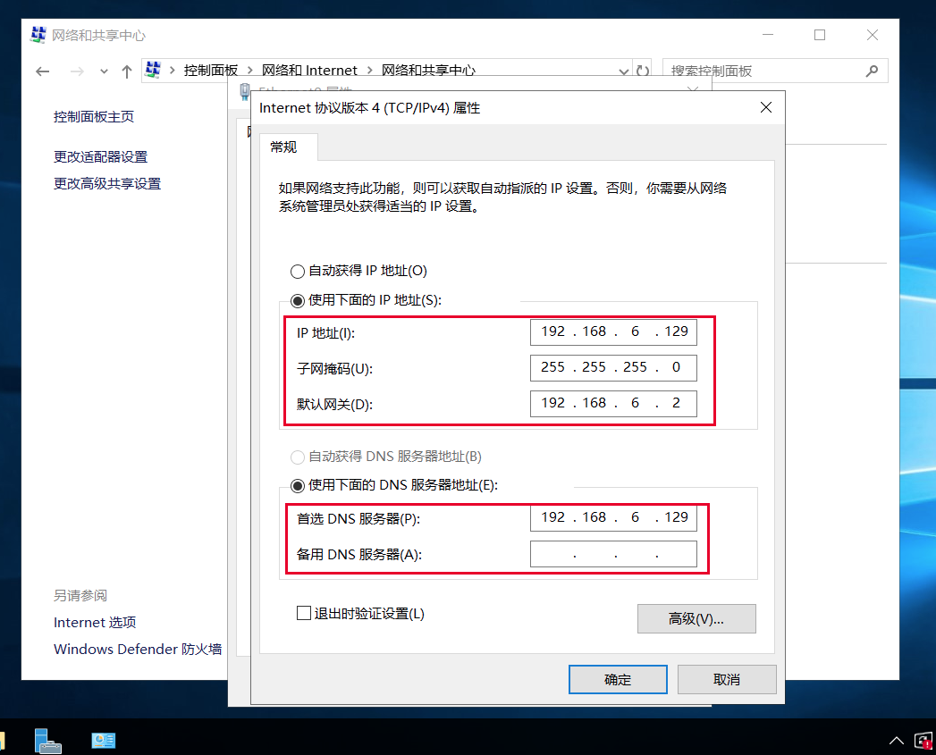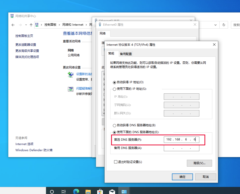 ctrl+r输入control, 进入 网络和Internet - 网络和共享中心 -Ethernet0- 属性 -Internet协议版本4- 勾选 使用下面的DNS服务器地址 ,将 ==首选DNS服务器填写为我们之前填的IP地址== :
