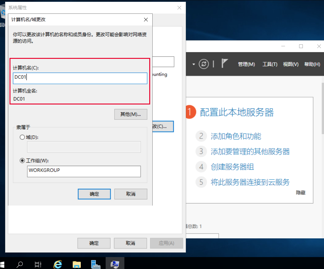 ctrl+r输入sysdm.cpl,回车 - 更改计算机名为DC01(表示第一台域控服务器) - 重启