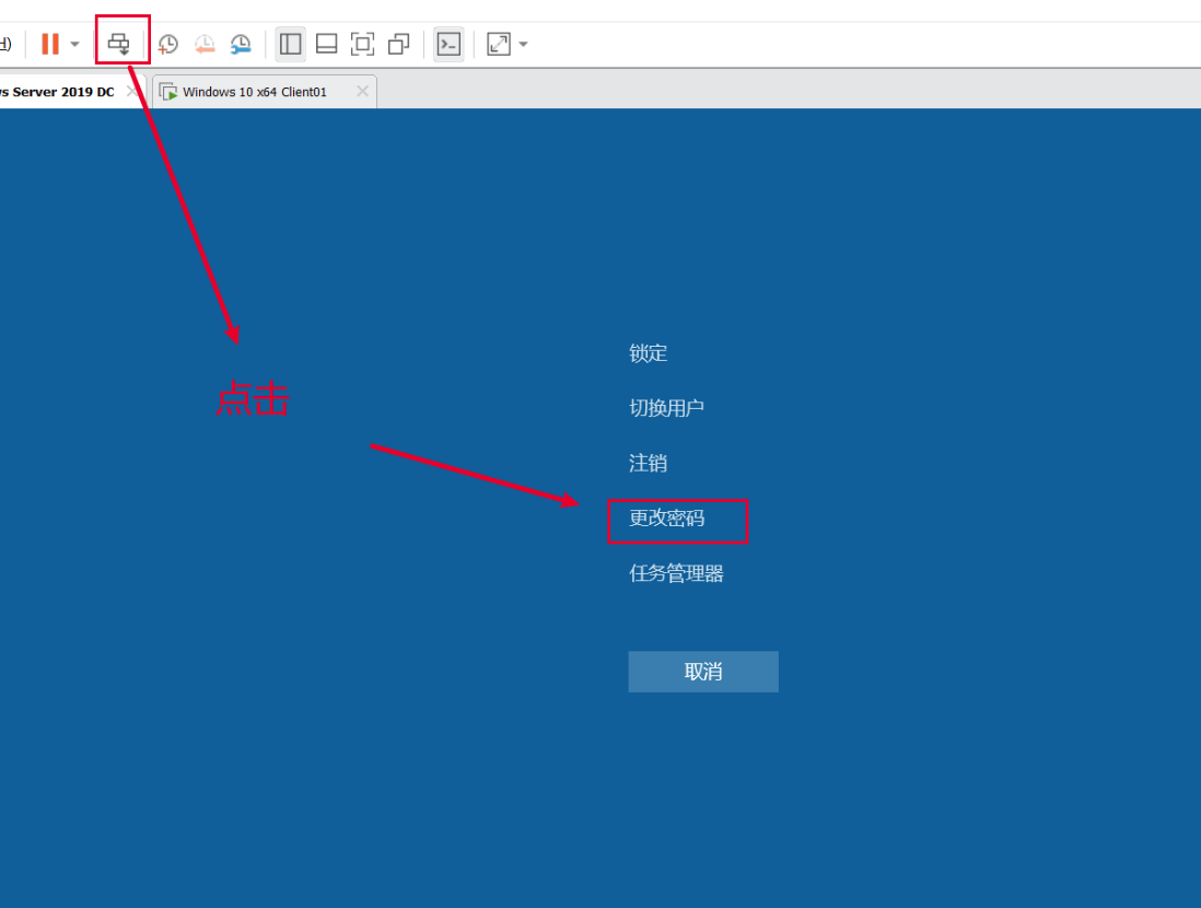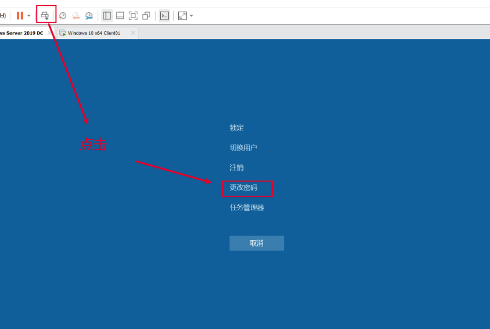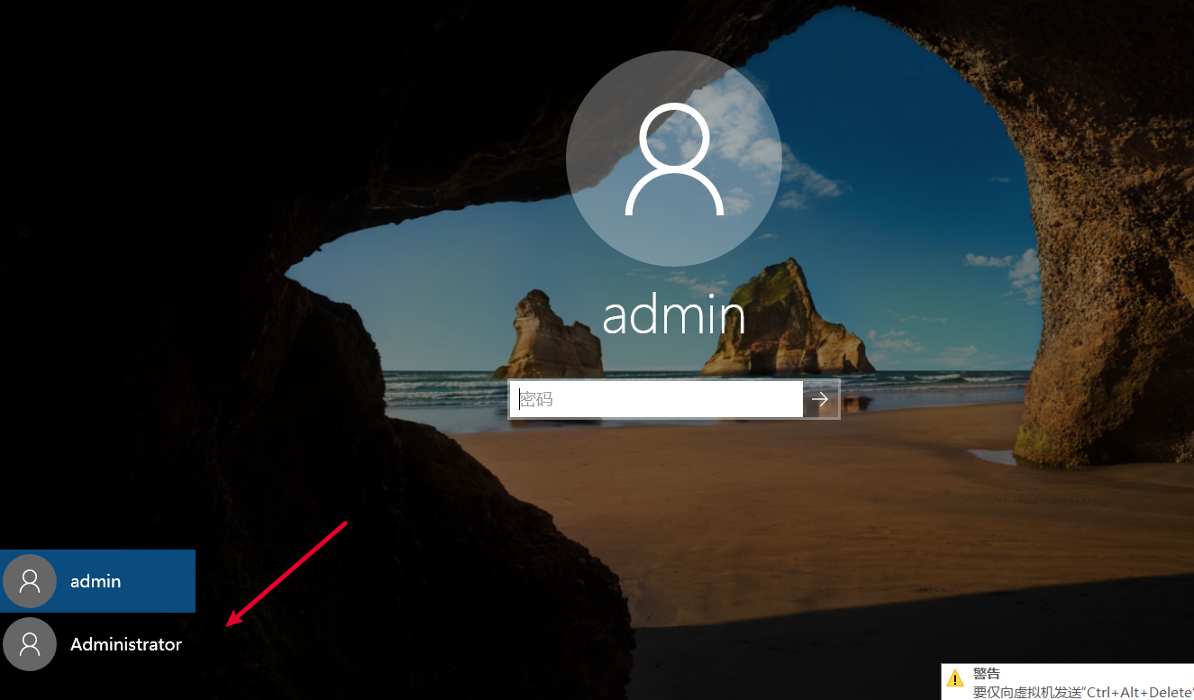 使用 Administrator 用户进入,点击下方左上角按钮向虚拟机发送 ctrl+alt+delete , 设置密码: First456.