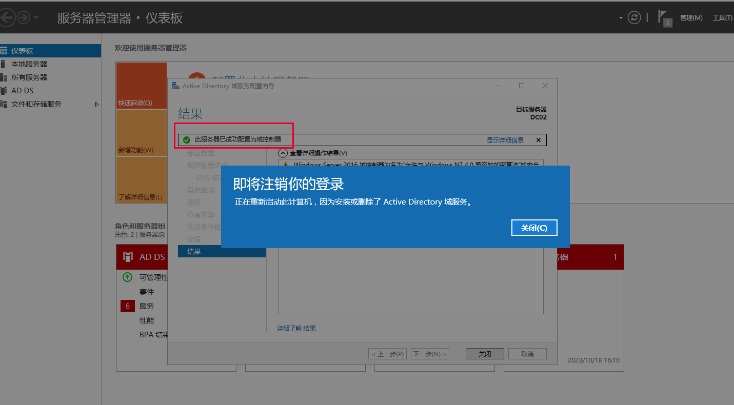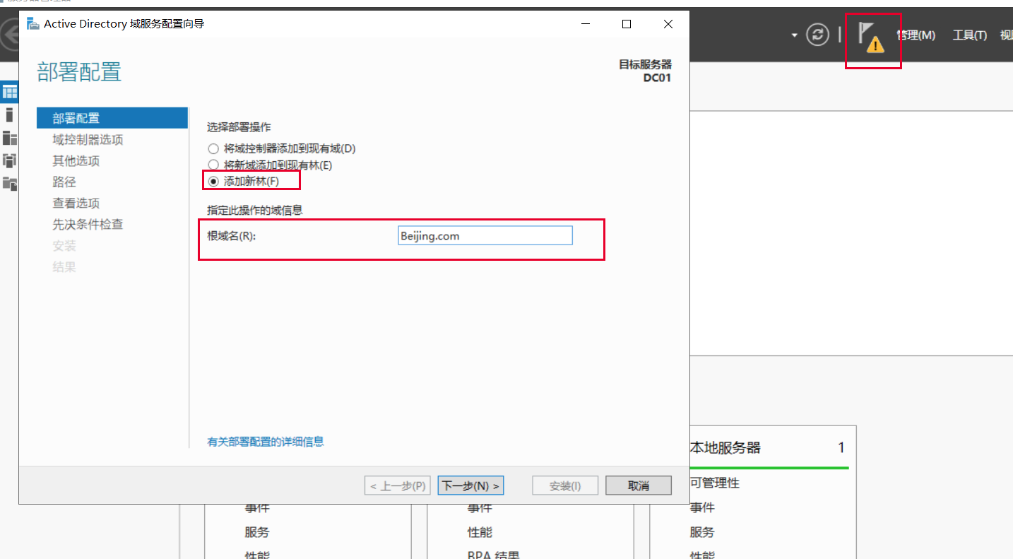 Active Directory 域服务- 添加功能 -下一步 - 下一步 - 勾选 ==如果需要,自动重新启动目标服务器== - 安装右上角 黄色感叹号 - 将此服务器提升为域控制器 - 添加新林 ,这里根域名我设置为