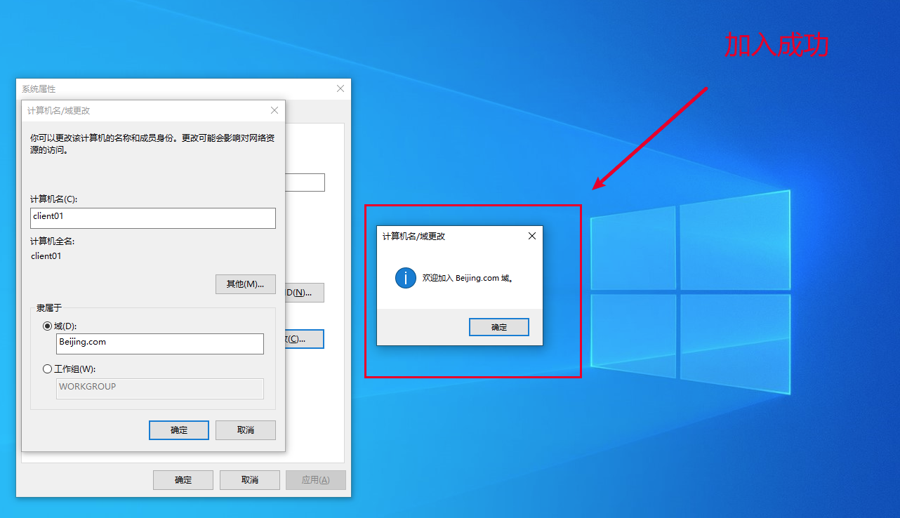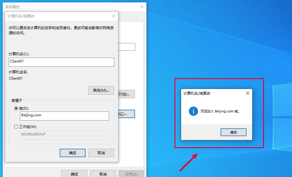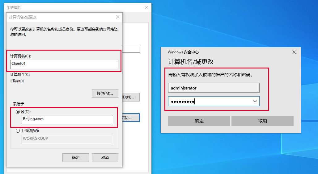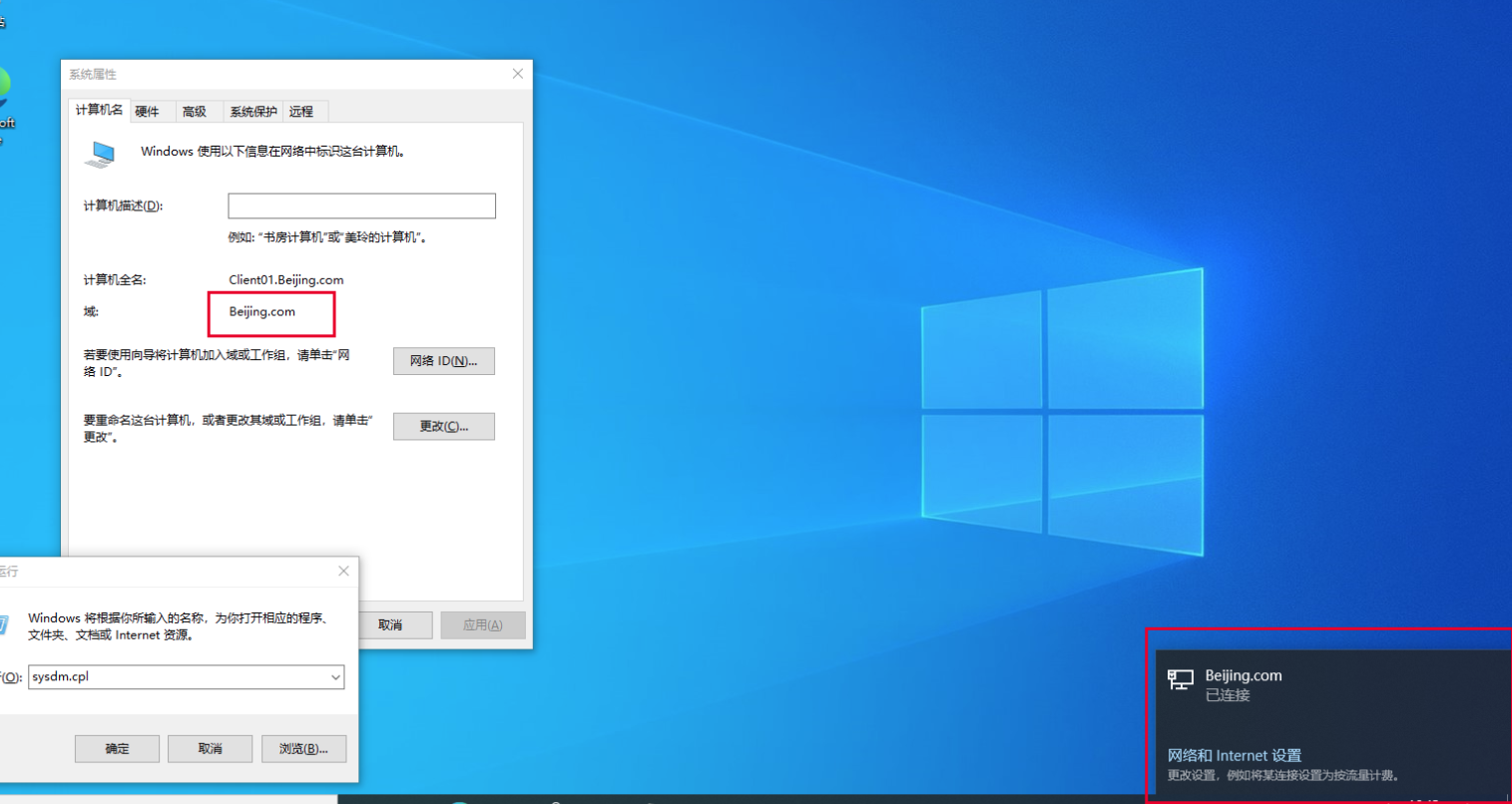 ctrl+r输入sysdm.cpl- 更改计算机名为client01, 域名是Beijing.com,然后输入域的管理员账号密码administrator:First456.,成功后重启