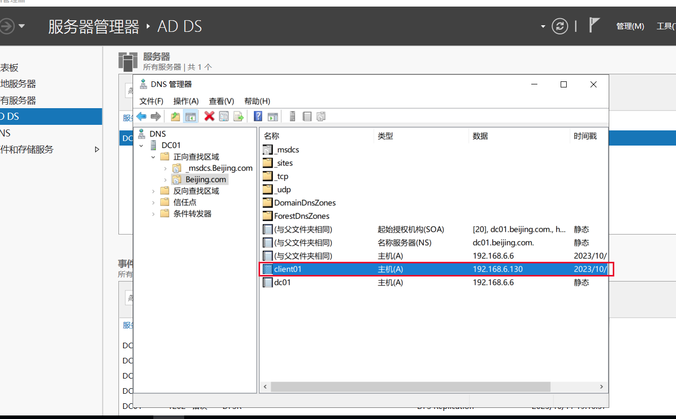 在2019域控服务器打开服务器管理器,右上角工具 - DNS - DC01 - 正向查找区域 -