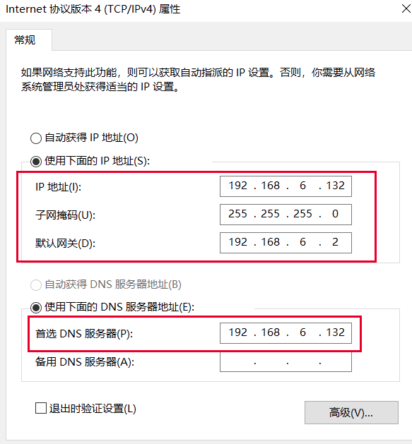 IPv4地址填写设置静态IP192.168.6.132,默认网关192.168.6.2,首选DNS服务器也选择192.168.6.132