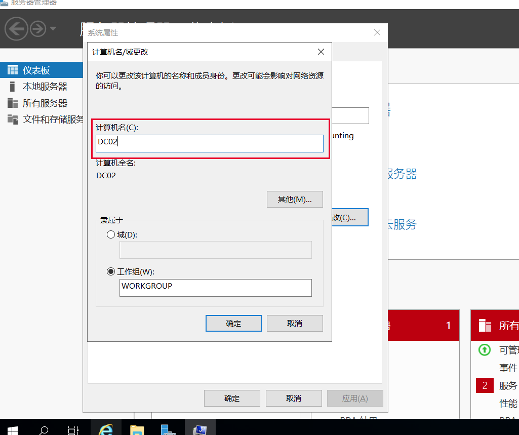 打开 ctrl+r 输入 sysdm.cpl ,回车 - 更改计算机名为 DC02 (表示第二台域控服务器) - 重启