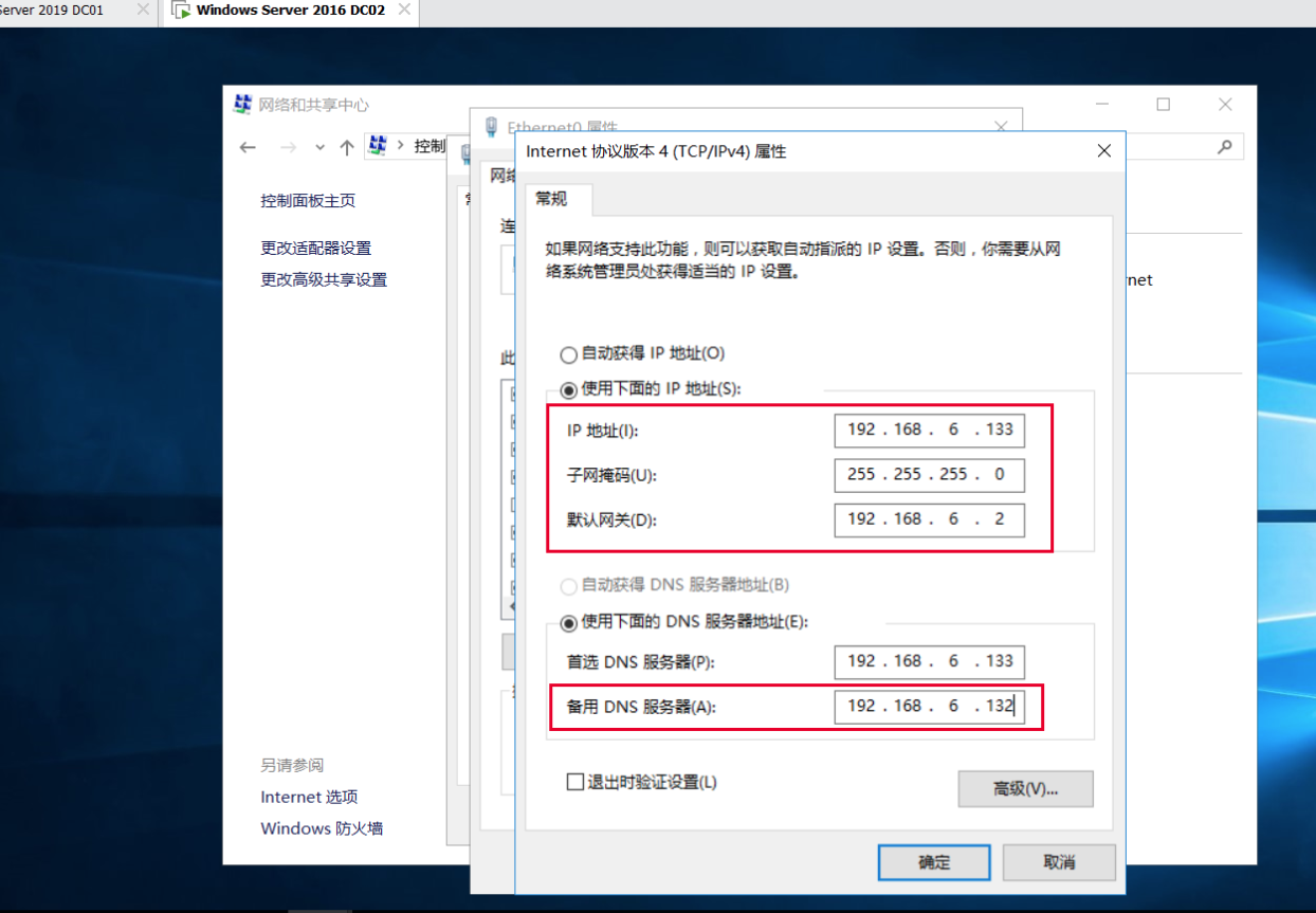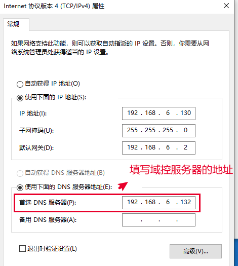 这边的 IPv4 地址为 192.168.6.133 ,IPv4 默认网关为 192.168.6.2 ,注意: 备用DNS服务器要填写第一台域控服务器的IP地址