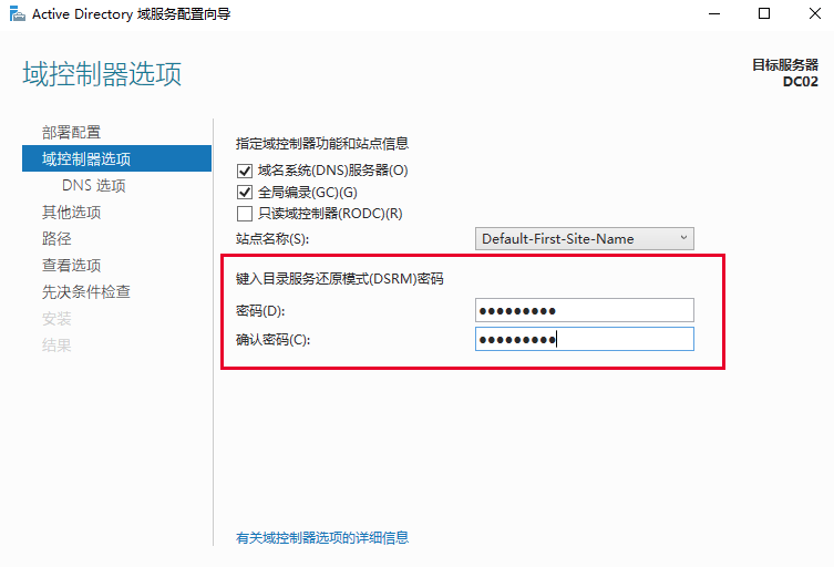 First456.- 下一步 - DNS选项 下一步 - 等待 NetBIOS 自己生成 - 路径 下一步 - 查看选项 下一步 - 先决条件检查 安装 - 自动重启- 路径这里的数据库文件夹、日志文件夹和SYSVOL文件夹我们保持默认即可