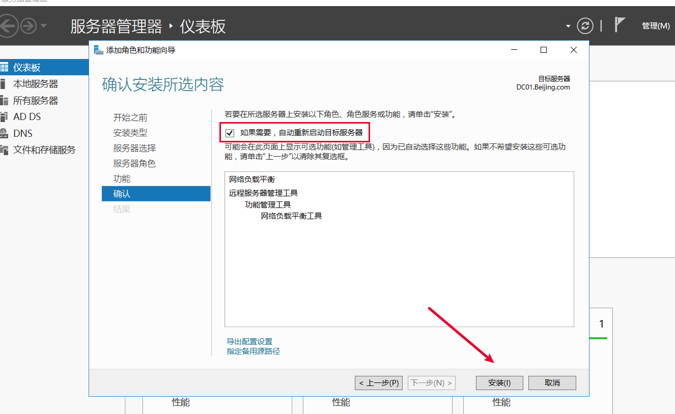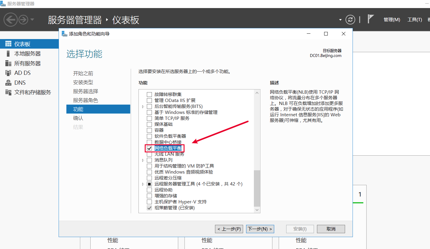 - 服务器管理器 - 添加角色和功能 - 开始之前下一步 - 基于角色或基于功能的安装下一步 - 从服务器池中选择服务器下一步 - 服务器角色下一步 - 功能勾选 网络负载均衡 - 确认
