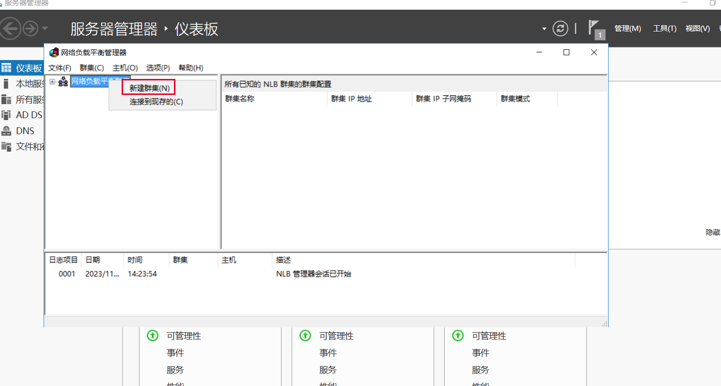 - 在左侧找到【网络负载平衡群集】,点击鼠标右键,选择【新建群集】