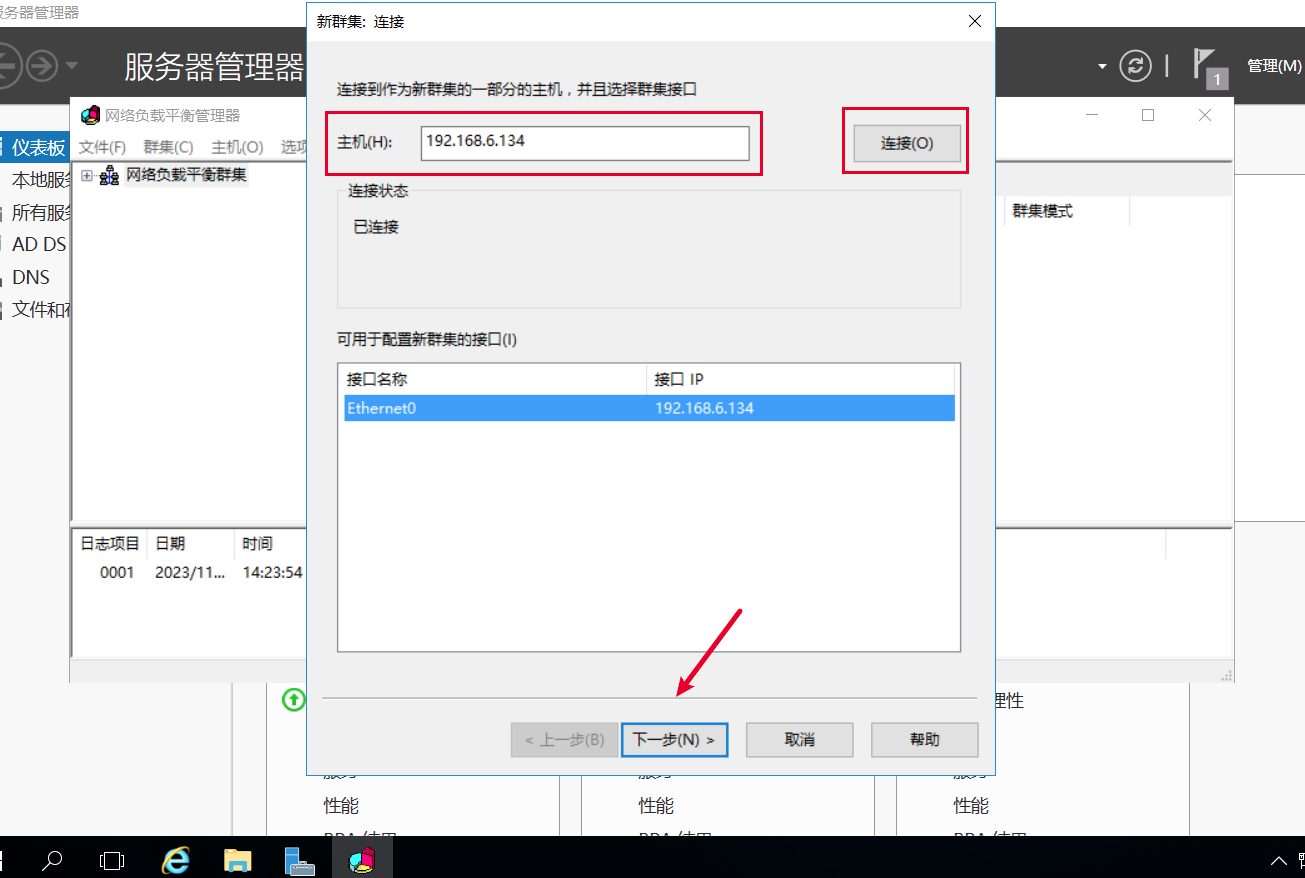 - 在主机栏中输入 DC01 的 IP 地址,然后点击【连接】,连接成功后,下方窗口会显示 DC01 的 IP 地址及网卡名称,点击【下一步】