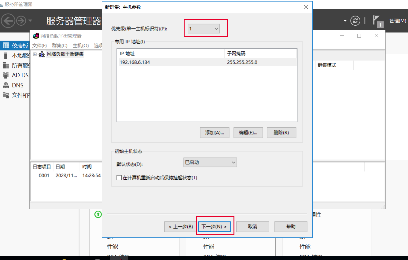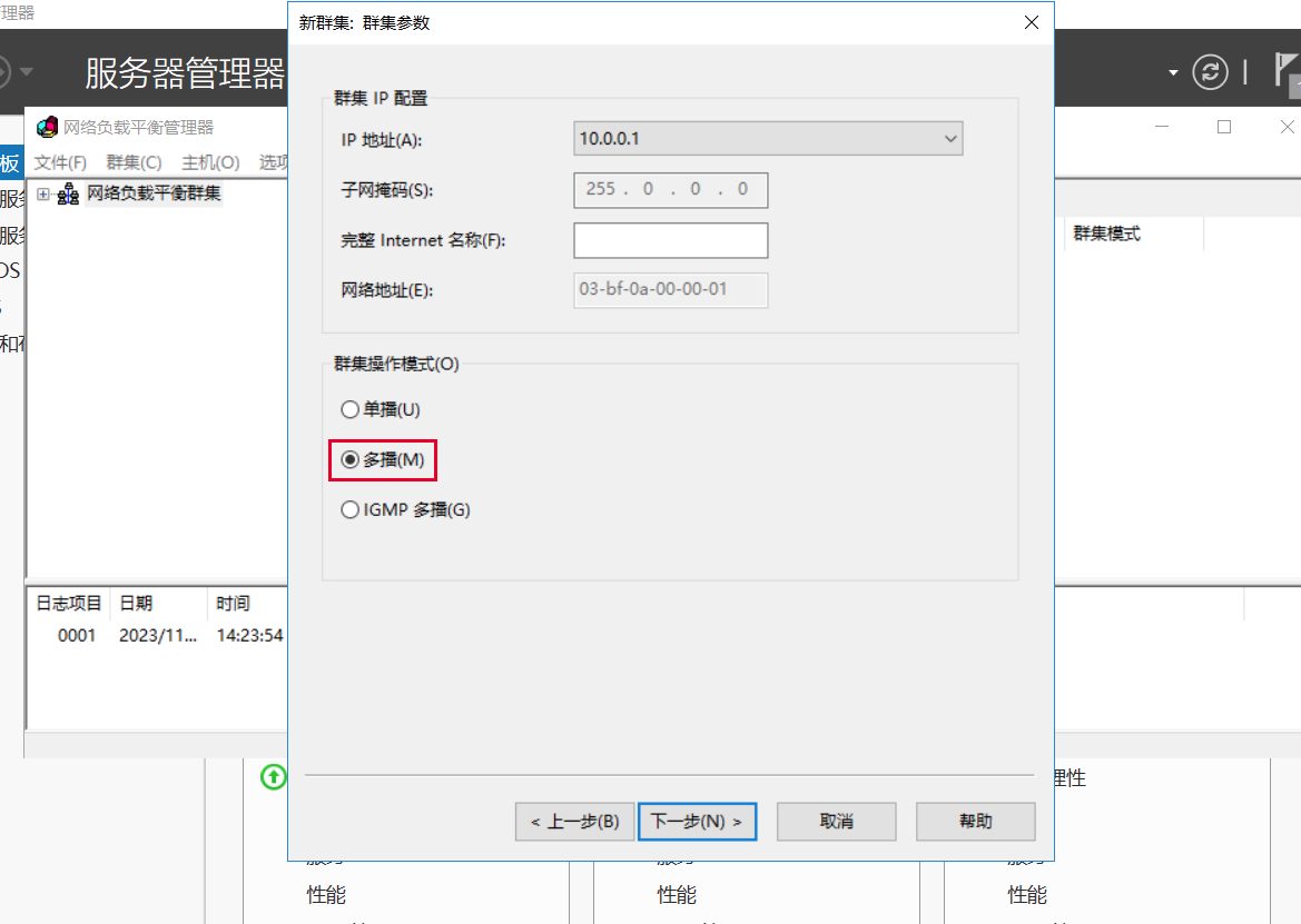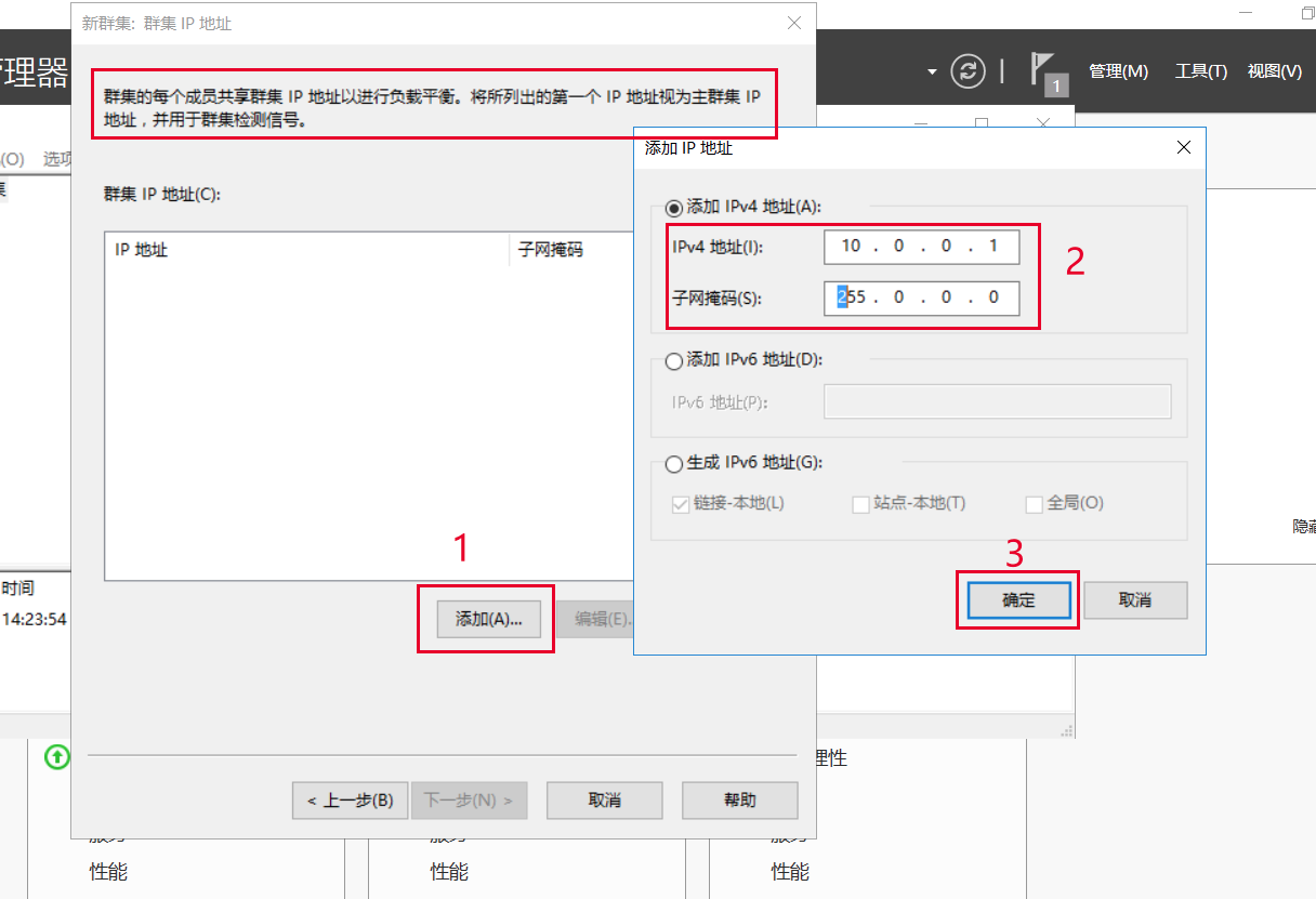- 设置负载平衡群集的共享群集IP地址,点击【添加】,设置群集IP地址为10.0.0.1,点击【确定】,返回后点击【下一步】