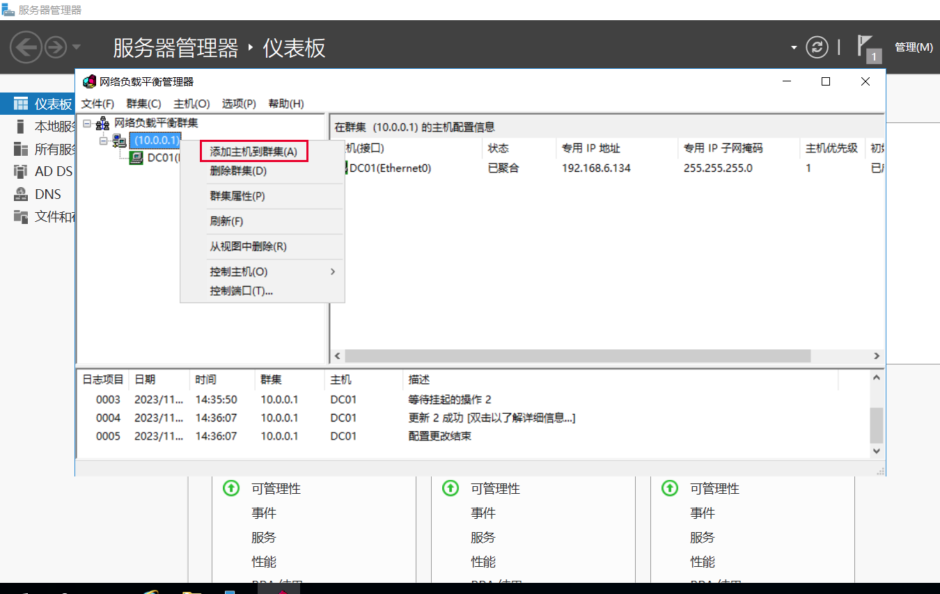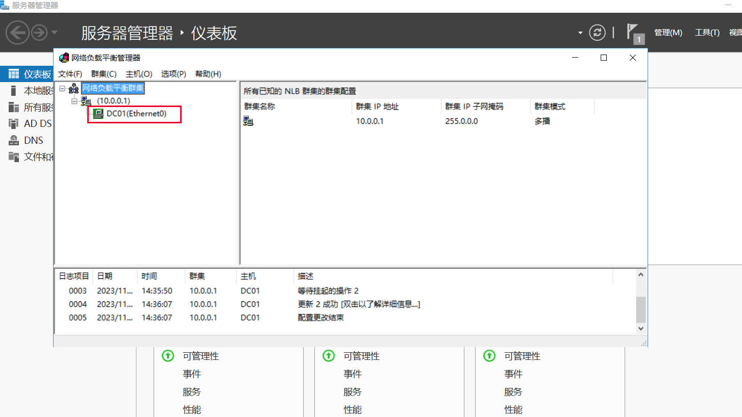 - 返回【网络负载平衡管理器】主页后,看到IP地址为10.0.0.1的群集已经被创建成功,已有成员DC01