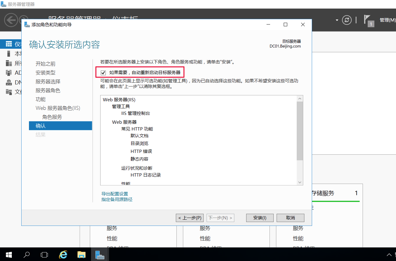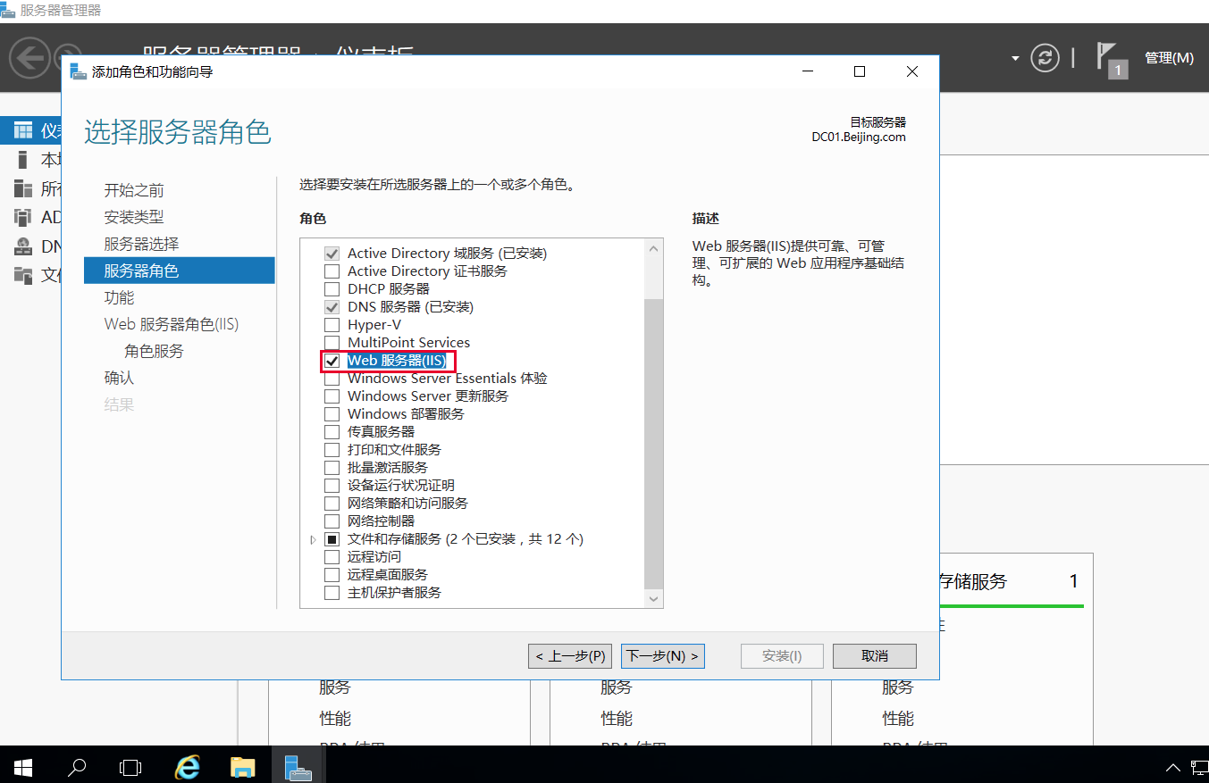 - 在DC01安装IIS服务器,打开【服务器管理器】,单击【添加角色和功能】 - 【基于角色或基于功能的安装】 - 服务器角色选择 Web服务器IIS - 功能下一步 - 角色服务下一步 - 确认安装