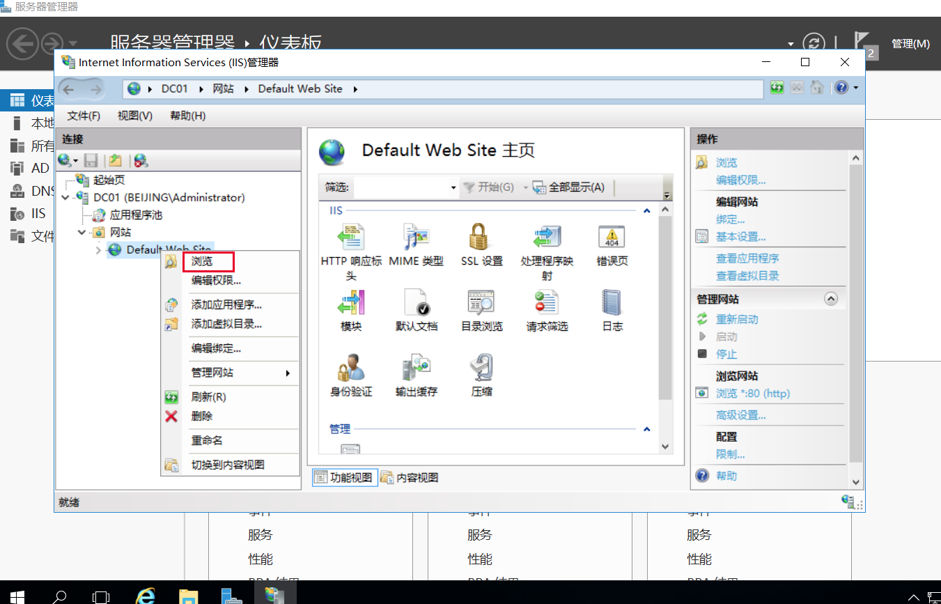 - 安装好后,在DC01 工具 - IIS管理器,展开左侧菜单栏,右键点击默认Web站点【Default Web Site】,选择【浏览】 - 会弹出wwwroot`文件夹