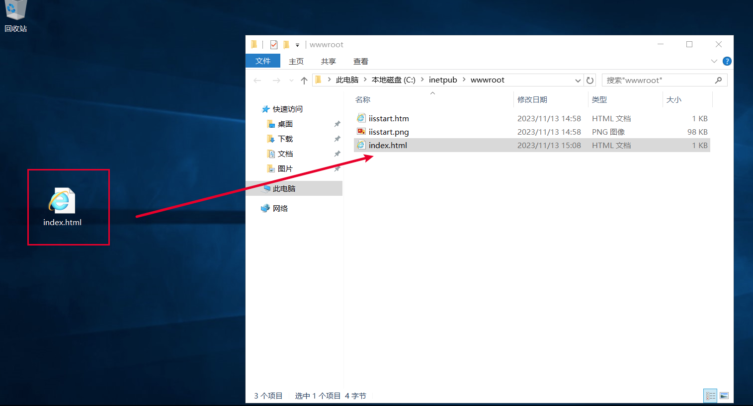 .html。将index.html复制到刚才打开的【wwwroot】文件夹中