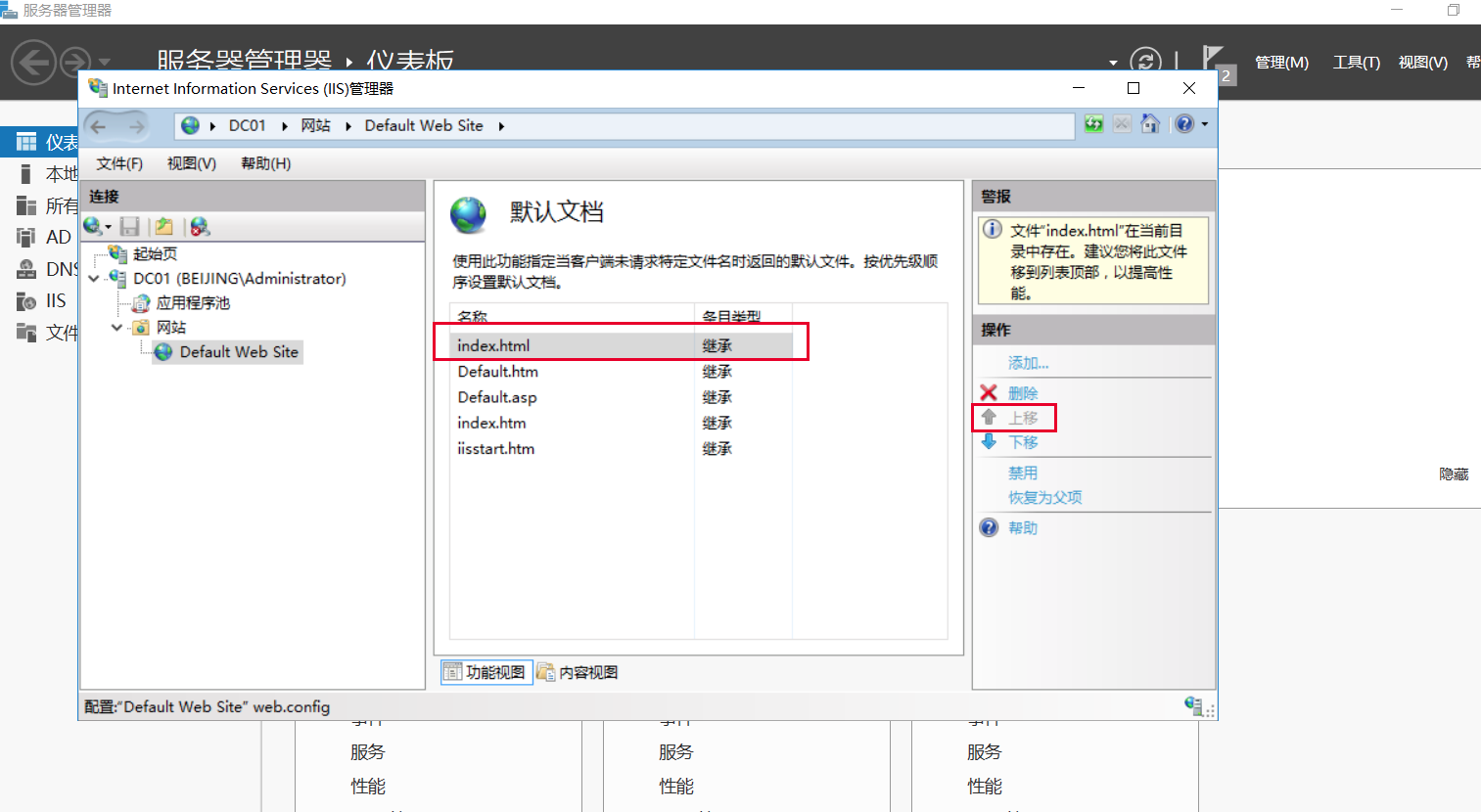 - 返回IIS管理器,双击进入【默认文档】,将【index.html】移动到最顶部,即优先识别【index.html】为Web站点的首页