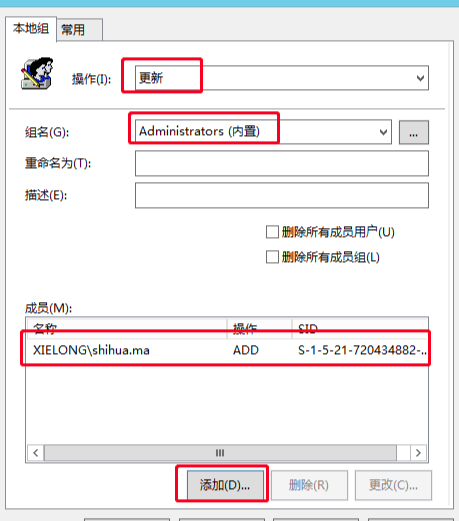 - 操作选项卡:更新,组名选项卡:Administrators(内置),添加要加入本地管理员组的域用户