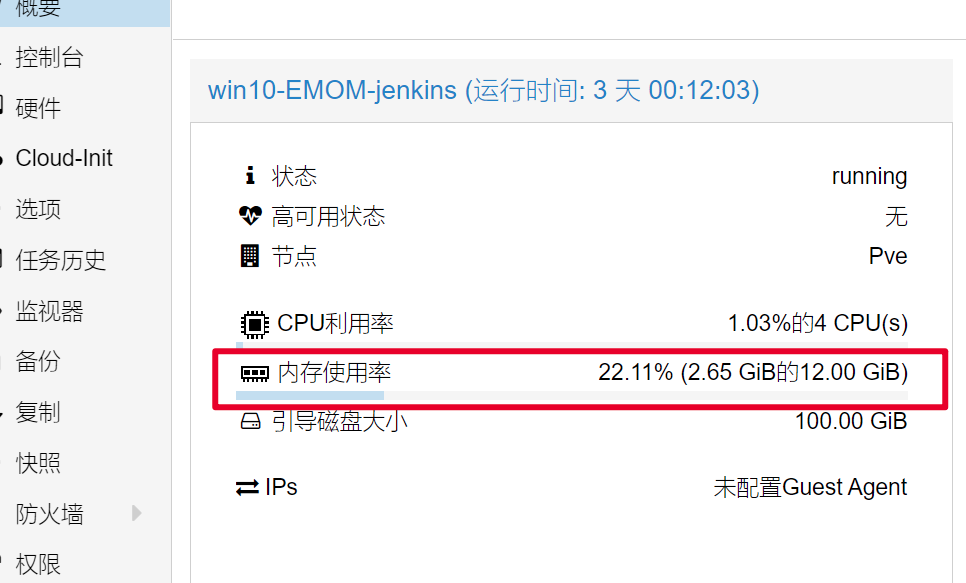 并且proxmox的web控制页面的对应的虚拟机的内存监控也正确显示了(没有按照驱动之前的内存一直显示90%+,是一个错误的数值)