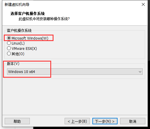 - 客户机操作系统选择”Microsoft Windows”,版本选择”Windows 10 x64”,然后”下一步”