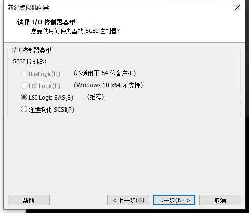 - I/O控制器类型保持默认的”LSI logic SAS”就可以,继续”下一步”