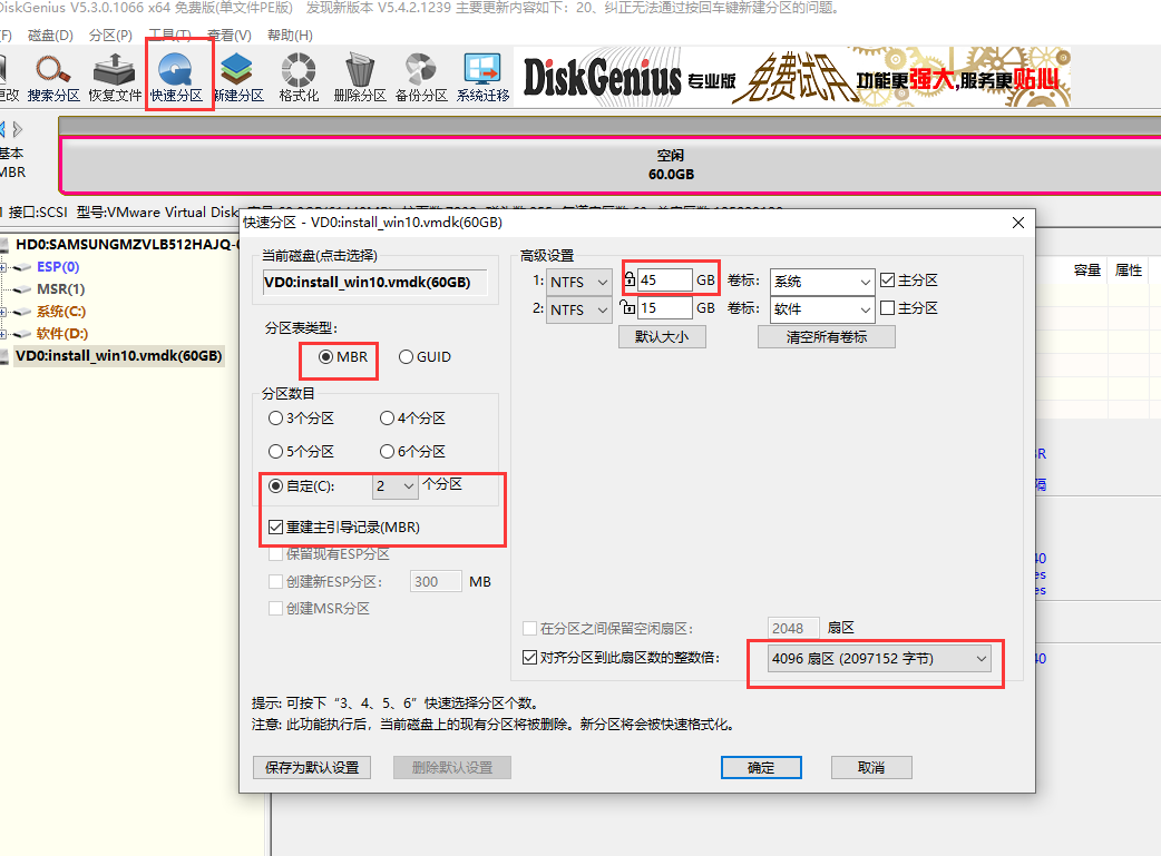 - 选中图中虚拟机磁盘,然后点击上面的”快速分区”,配置如图