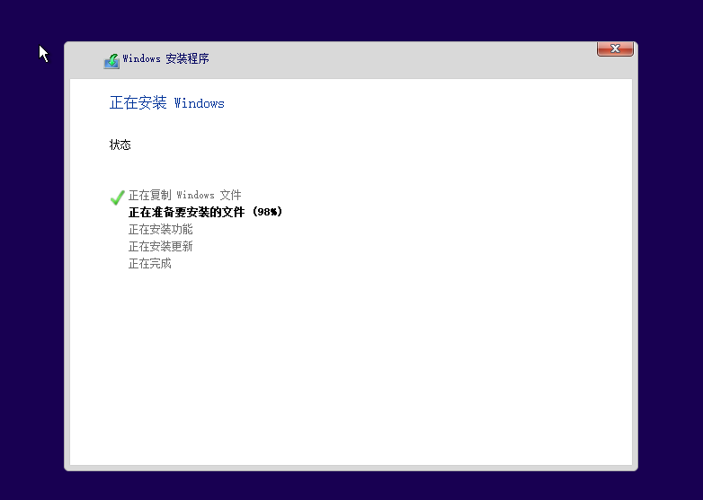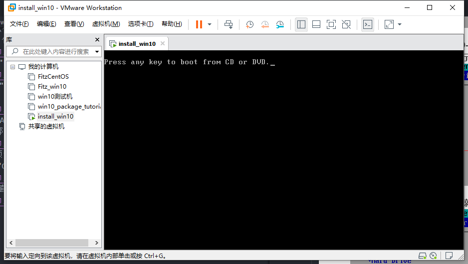 - 千万要注意:在这个过程中,虚拟机系统可能会重启几次,当虚拟机重启再次出现”Press any key to boot from CD or DVD…”时,千万不要再动键盘让它自己跳过去,不然的话,它会再次重新进行win10系统的安装