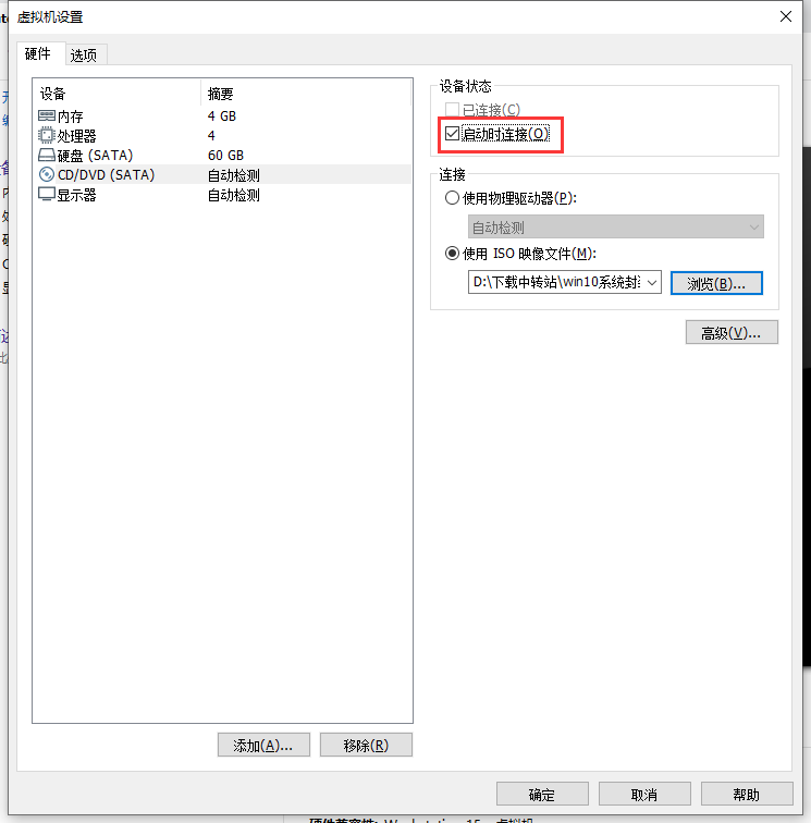 去虚拟机设置中先移除旧的CD/DVD(SATA),然后再添加新的并取消勾选启动时连接