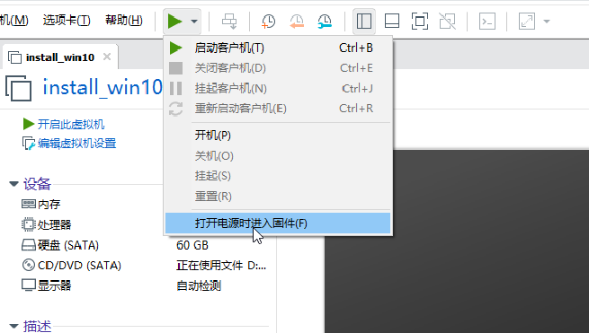 接下来返回到虚拟机主界面,点击图中大绿色三角后面的小三角符号,在下拉框中选择”打开电源时进入固件”,这一步是为了进入虚拟机的BIOS,如图